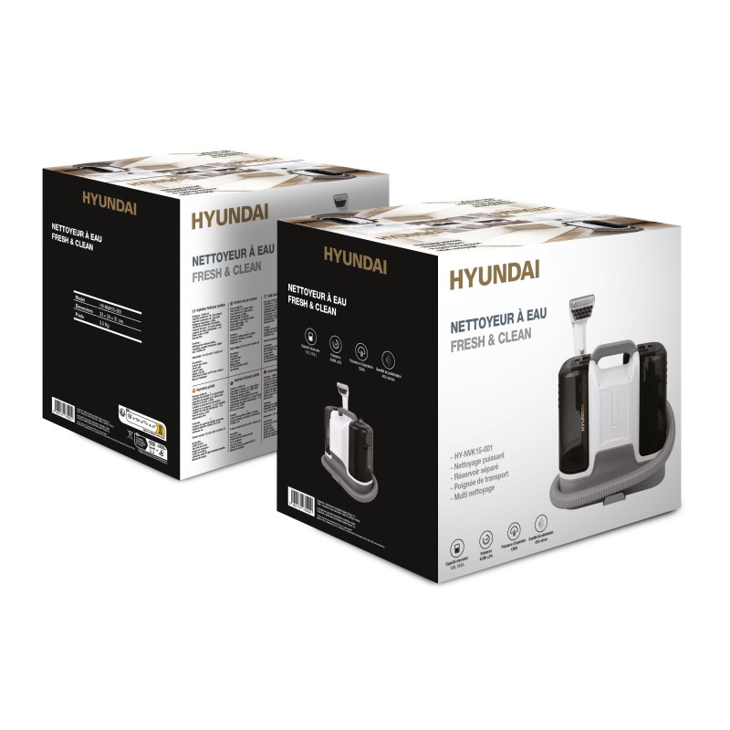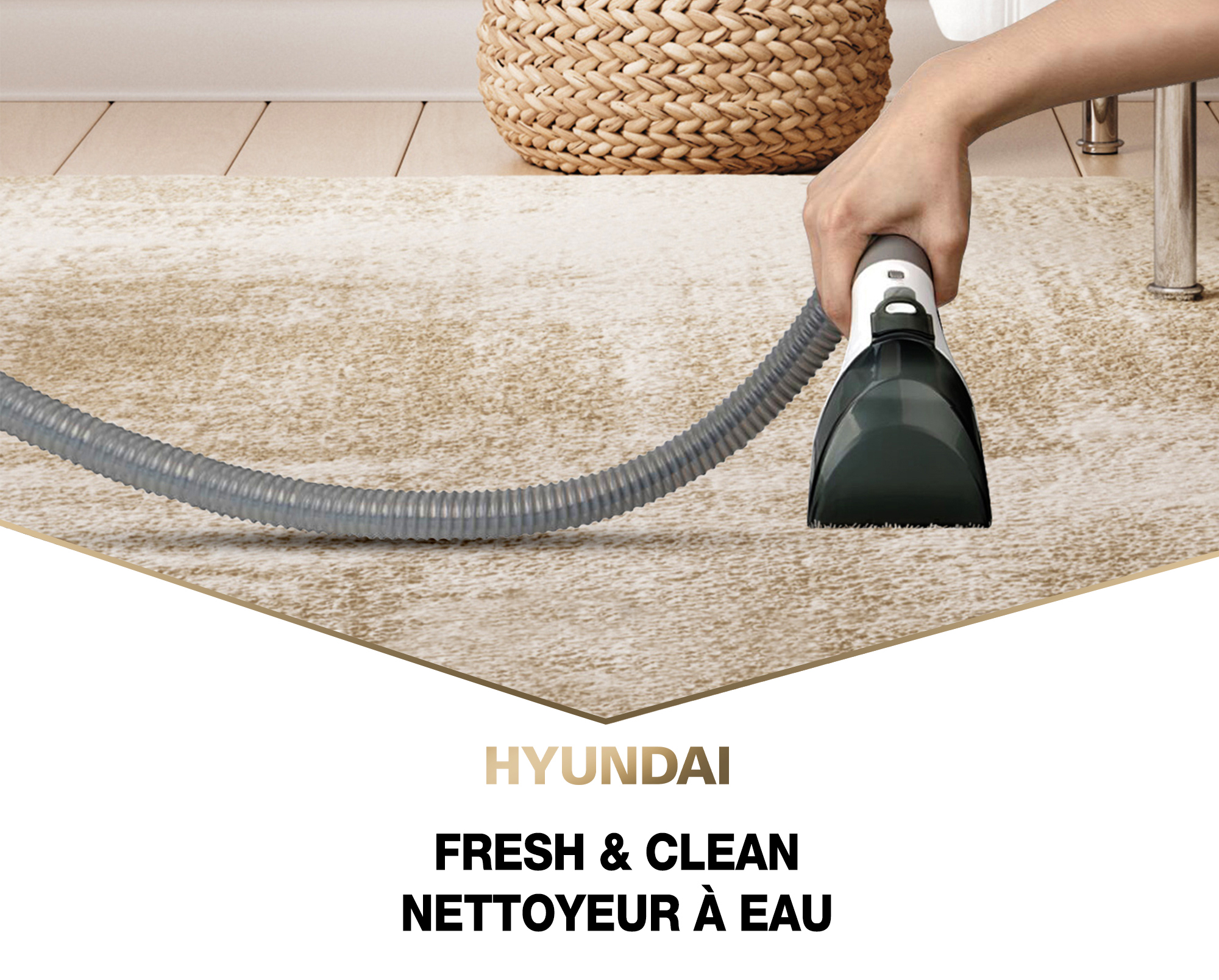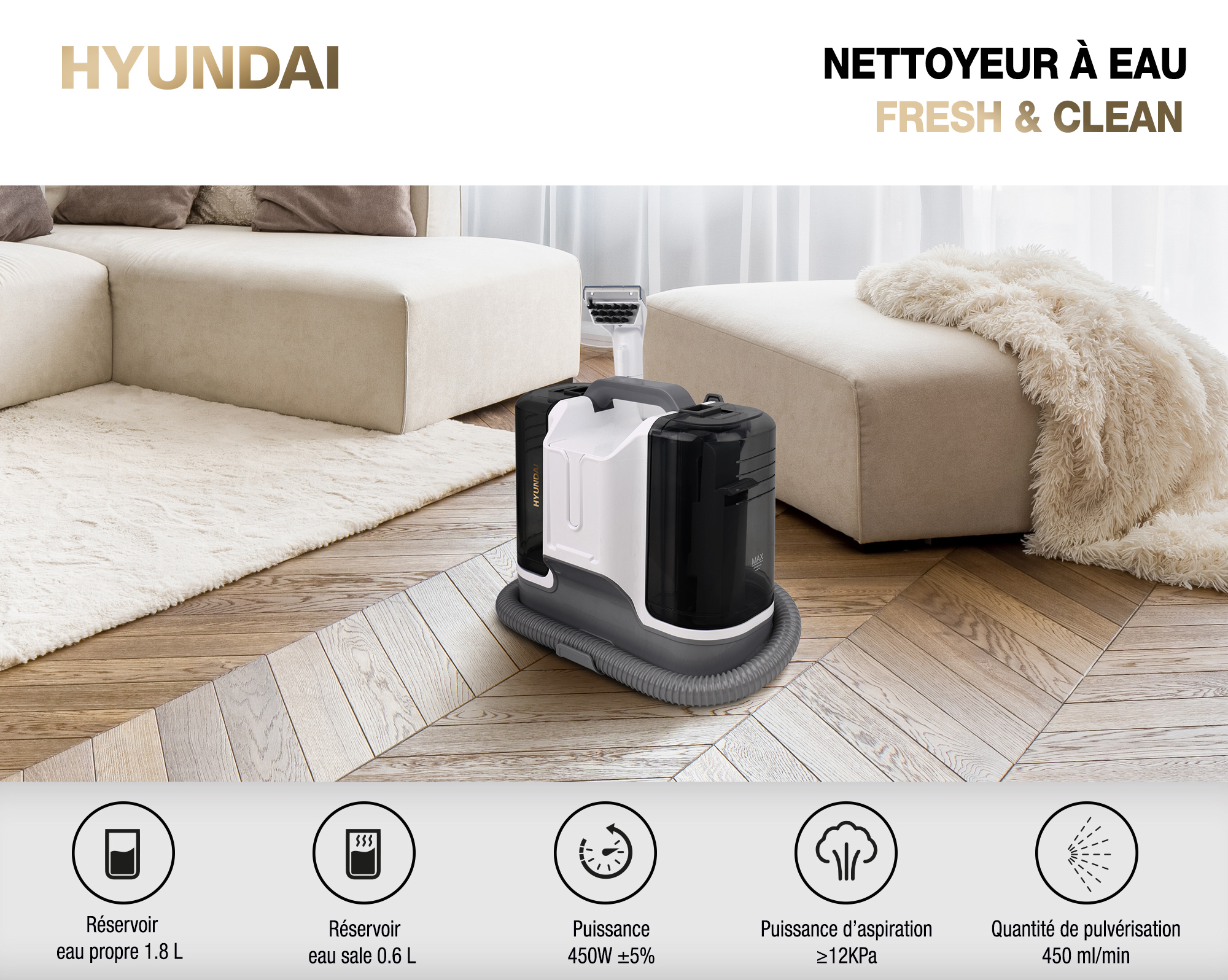 L'aspirateur Nettoyeur à eau HYUNDAI Fresh & Clean a une capacité de 1.8 L pour l'eau propre et de 0.6L pour l'eau sale, compact et léger il est idéal pour nettoyer une variété de surfaces, y compris les textiles, les sols, les rideaux et les fenêtres.