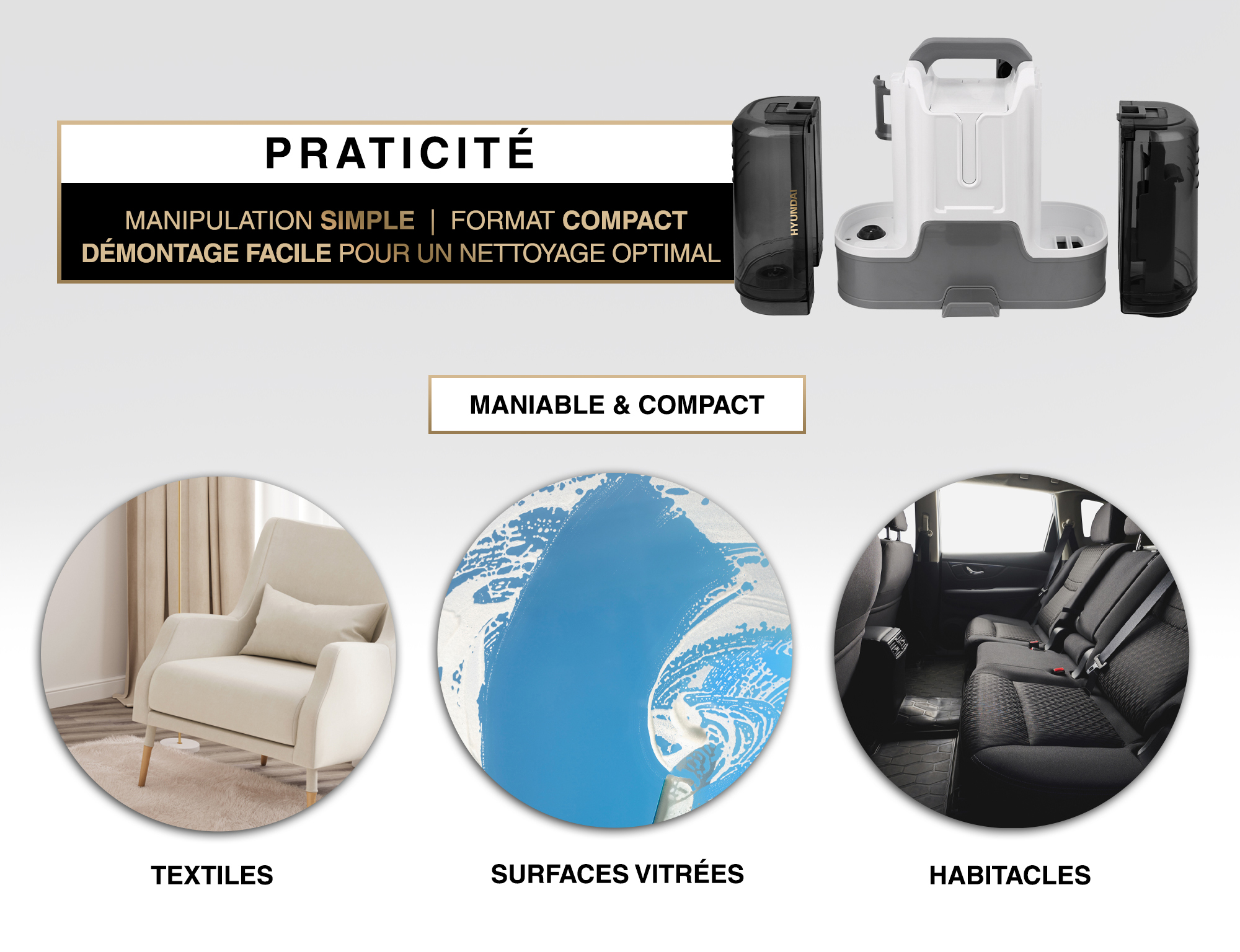 Avec une puissance d'aspiration de 12 kPa, il peut facilement éliminer la saleté et les taches, le tuyau de 1,3m vous permet d'atteindre facilement les zones difficiles.