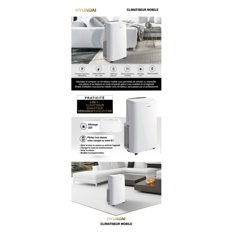 Le climatiseur mobile blanc HYUNDAI 12000 btu avec son design discret et sa grande capacité frigorifique est parfait pour refroidir n'importe quelle pièce de votre maison.