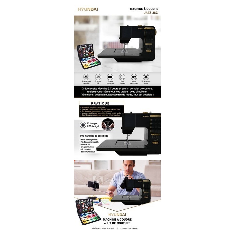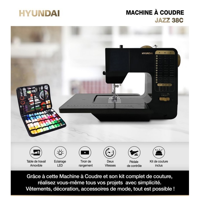 Avec la machine à coudre HYUNDAI Jazz 38C, découvrez de nouvelles possibilités dans le monde de la couture ! Sa particularité ? Une table de travail amovible pour vous offrir un plus grand confort de couture. Complète, elle est fournie avec un kit de 100 pièces (fils, aiguilles, bobines, épingles, mètre ruban, ciseaux...) qui vous permettra de commencer vos premiers projets dès l'ouverture du carton ! Performante, elle vous offre 38 points de couture différents et un ingénieux système automatisé pour faire les boutonnières en 4 étapes. Pour votre confort, elle est équipée d'une pédale de contrôle, de deux vitesses de couture et de l'éclairage LED intégré.