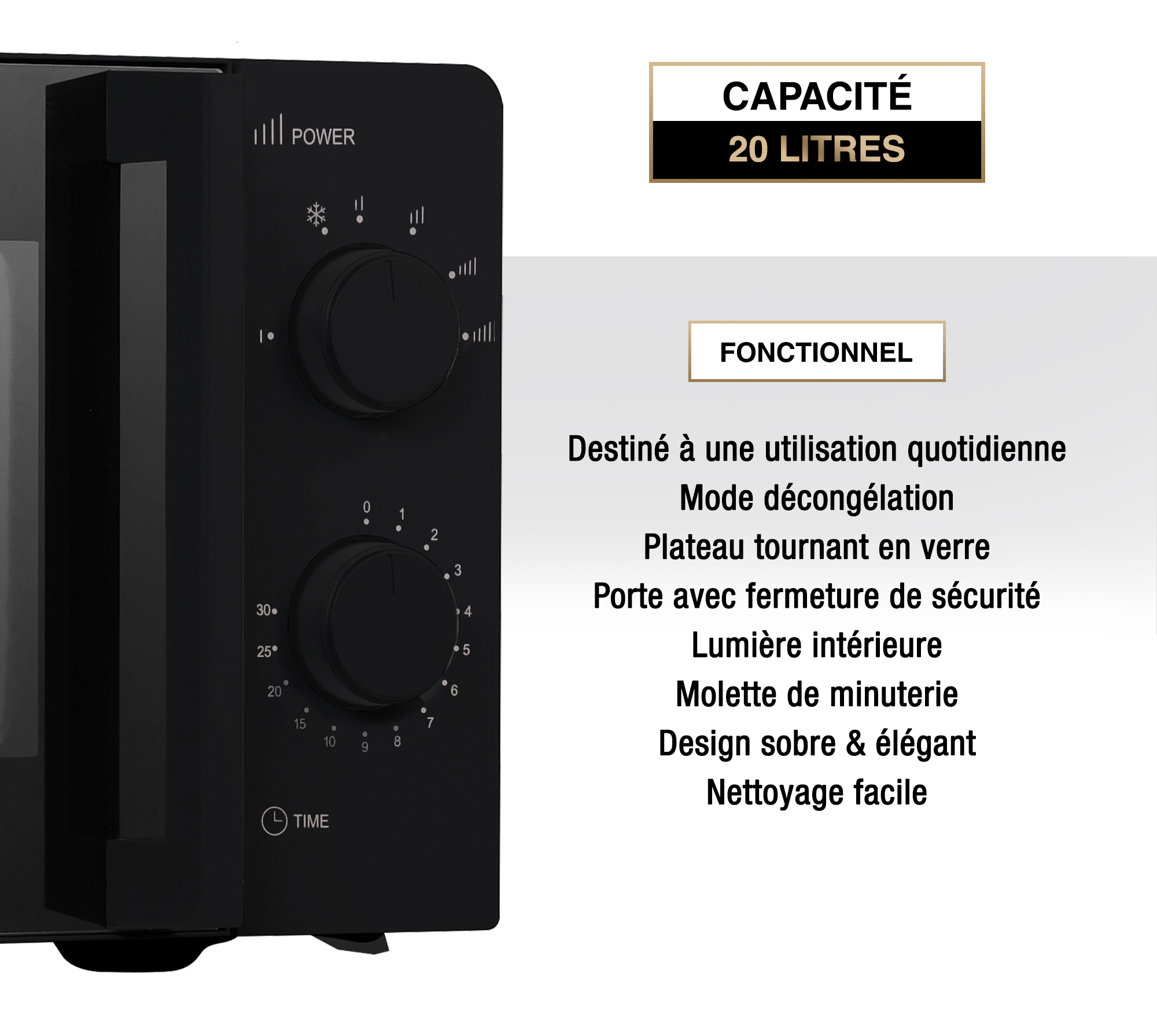 Son plateau tournant en verre de 24,5 cm assure une rotation régulière de vos plats, favorisant une cuisson homogène.