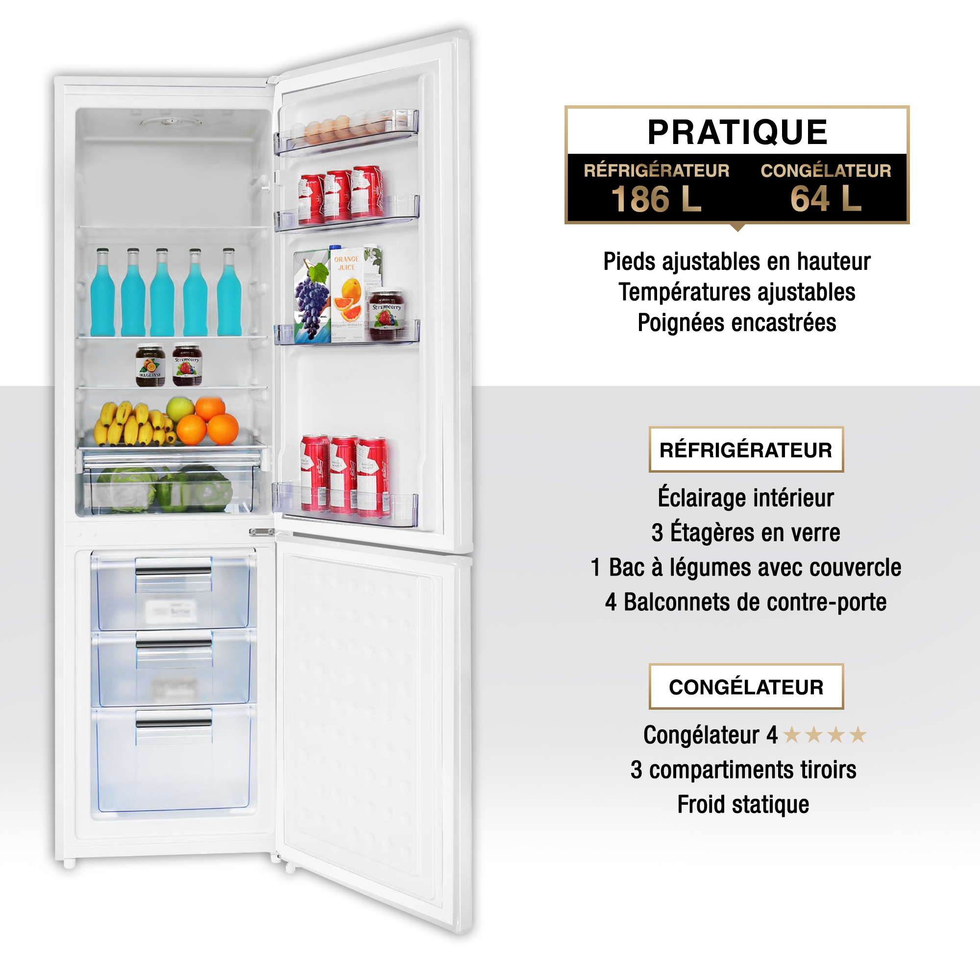 Avec un réfrigérateur de 186L et un congélateur 4* de 64L en bas, ce modèle facilite l'accès à vos produits. Les 3 compartiments tiroirs du congélateur vous permettent de garder vos aliments bien rangés, tandis que le bac à légumes préserve la fraîcheur de vos fruits et légumes. Les étagères en verre faciles à nettoyer et les balconnets de porte offrent une flexibilité inégalée pour un rangement personnalisé.