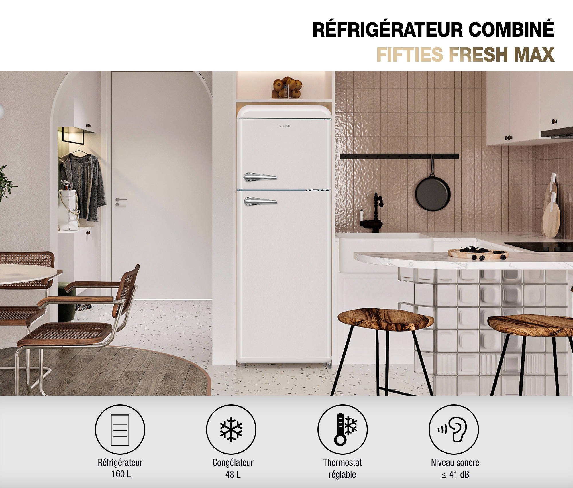 Plongez dans l'ère glamour des années 50 avec notre réfrigérateur HYUNDAI "FIFTIES FRESH MAX" 208 litres, le compagnon idéal pour ajouter une touche de style rétro à votre cuisine ! Alliant l'esthétique à la performance, ce réfrigérateur offre une expérience ultime de fraîcheur et de praticité.