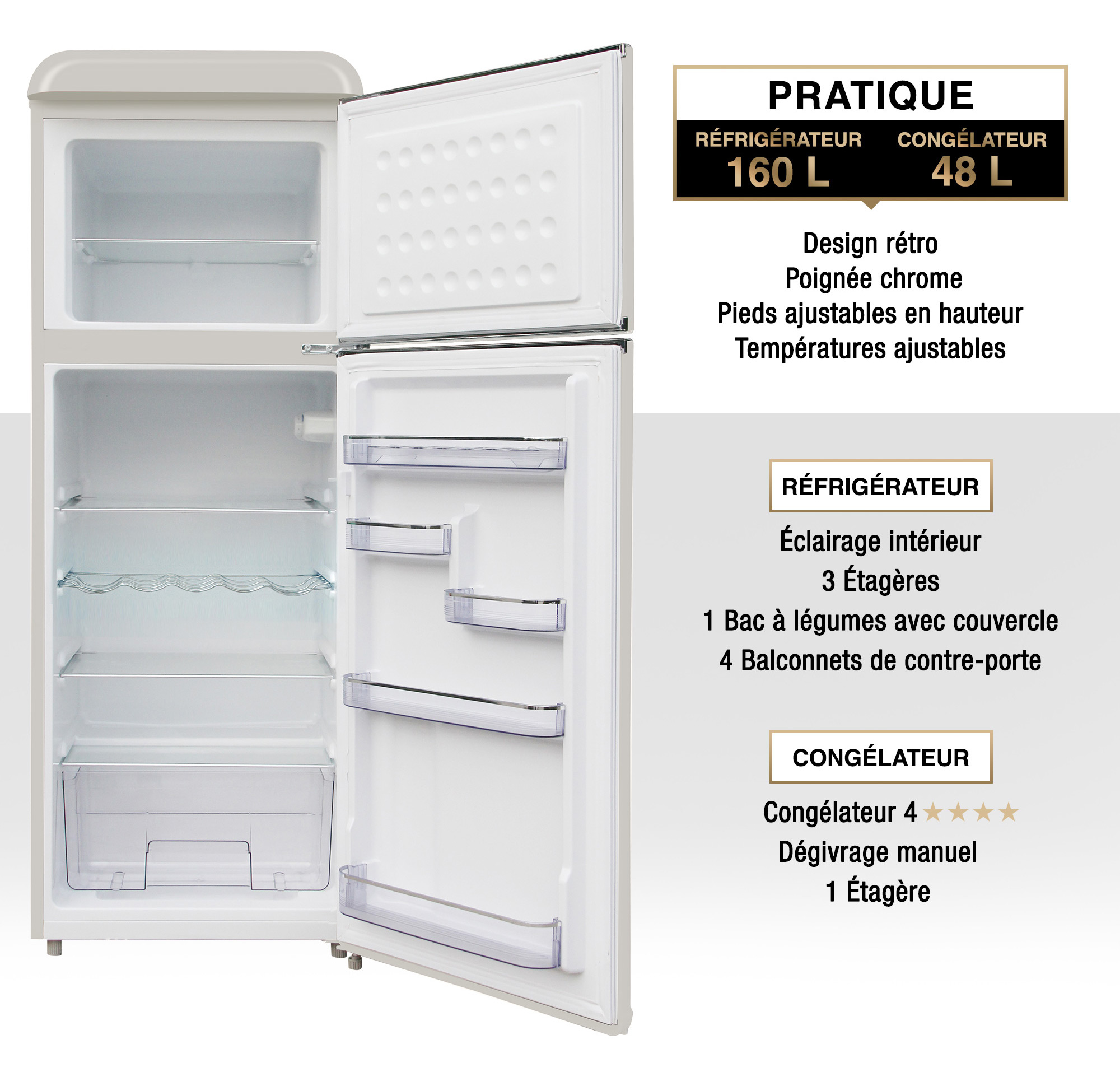 Avec une capacité de 160L pour le réfrigérateur et 48L pour le congélateur, vous disposez de suffisamment d'espace pour stocker tous vos produits frais et congelés, vous permettant ainsi de garder une alimentation saine et variée à portée de main.