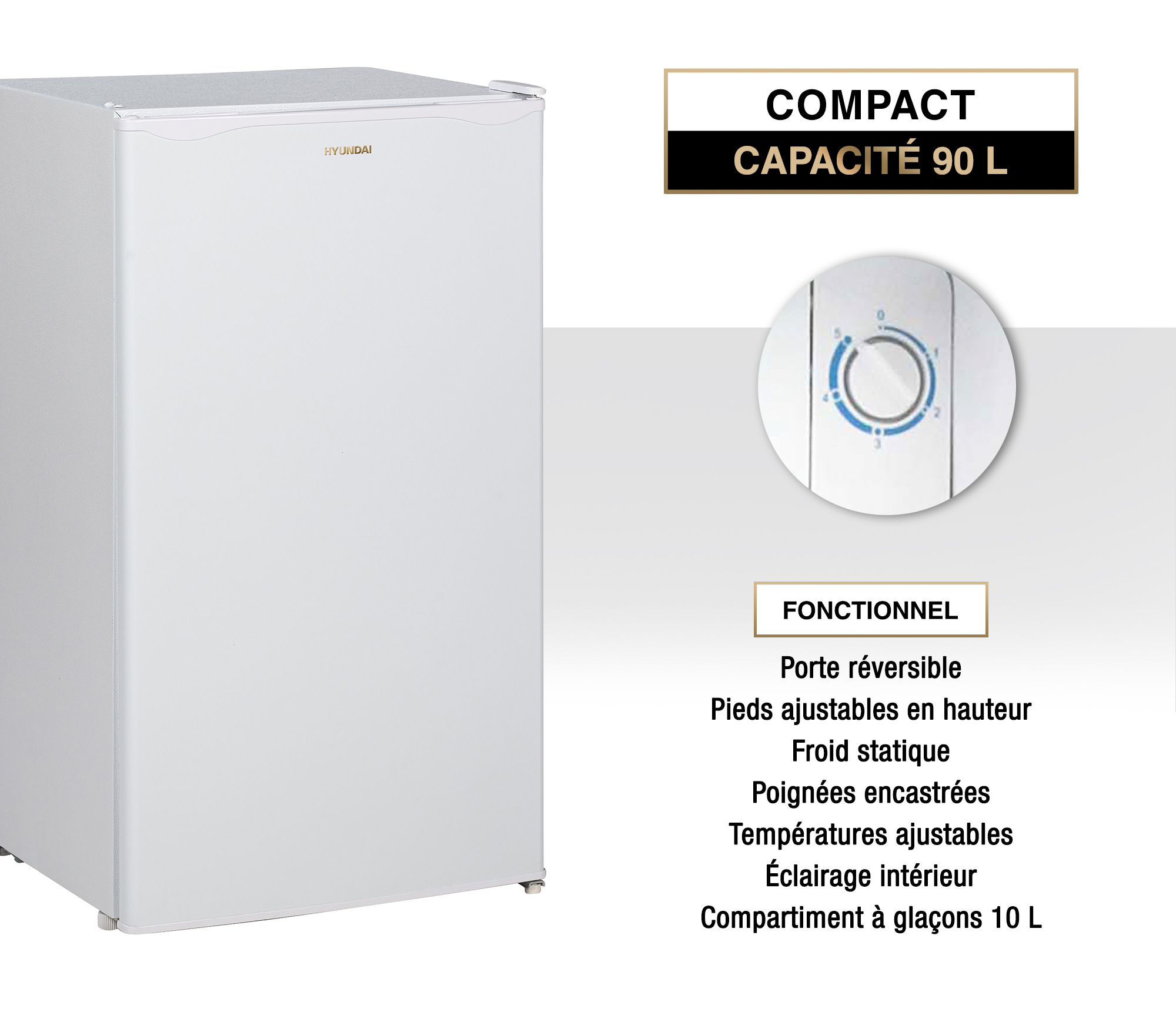 Gardez vos aliments frais avec le réfrigérateur compact KEEP FRESH de Hyundai, parfait pour les petits espaces tels que les studios ou les bureaux. Avec sa capacité de 91L, il offre suffisamment d?espace pour toutes vos provisions tout en restant peu encombrant.