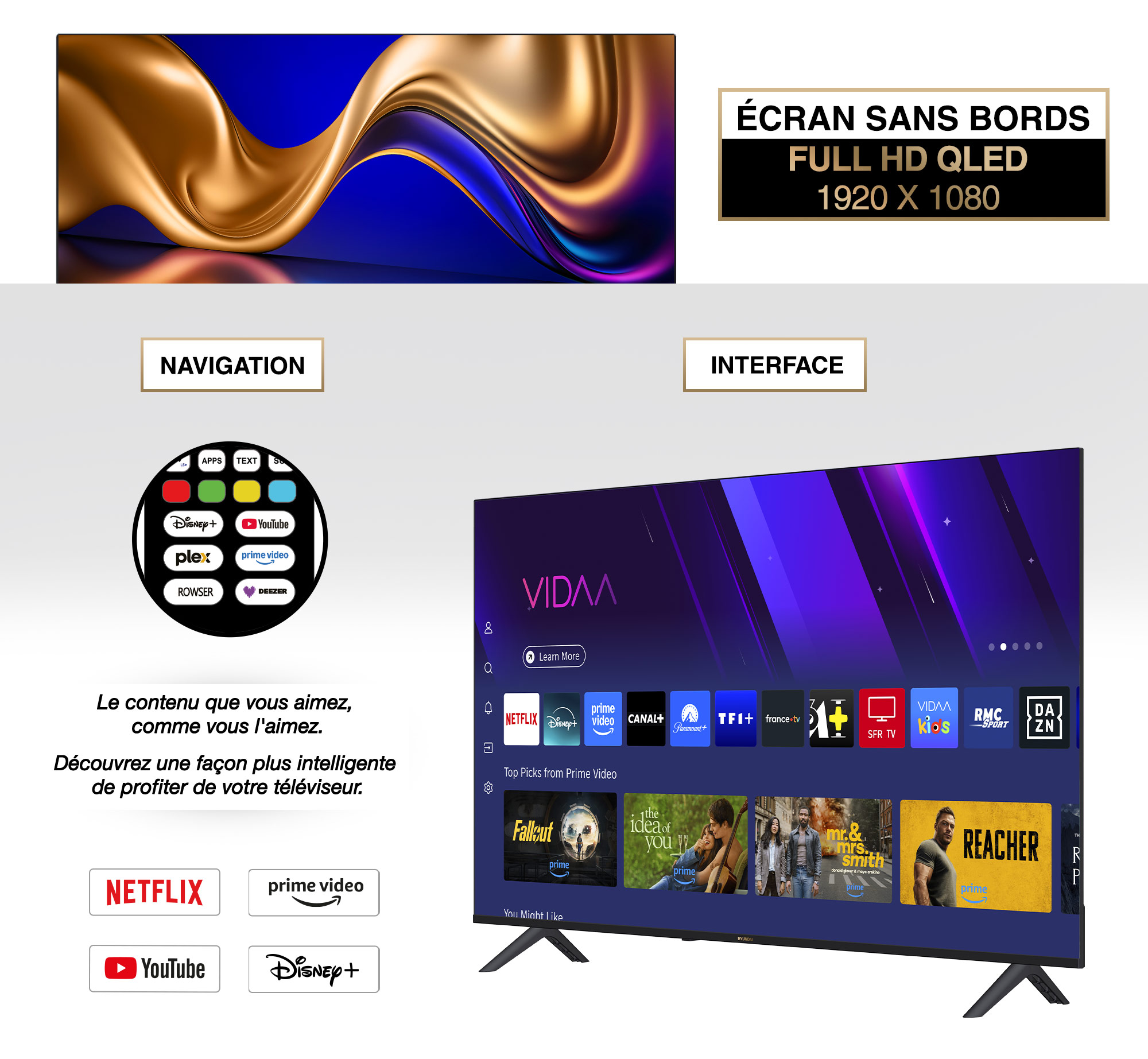 Pensée pour s’intégrer parfaitement à votre quotidien connecté, cette Smart TV dispose d’une interface fluide et intuitive vous donnant accès rapidement à vos applications favorites comme Netflix, YouTube et Prime Video. Plus besoin d’appareil externe : votre divertissement est accessible en un instant.