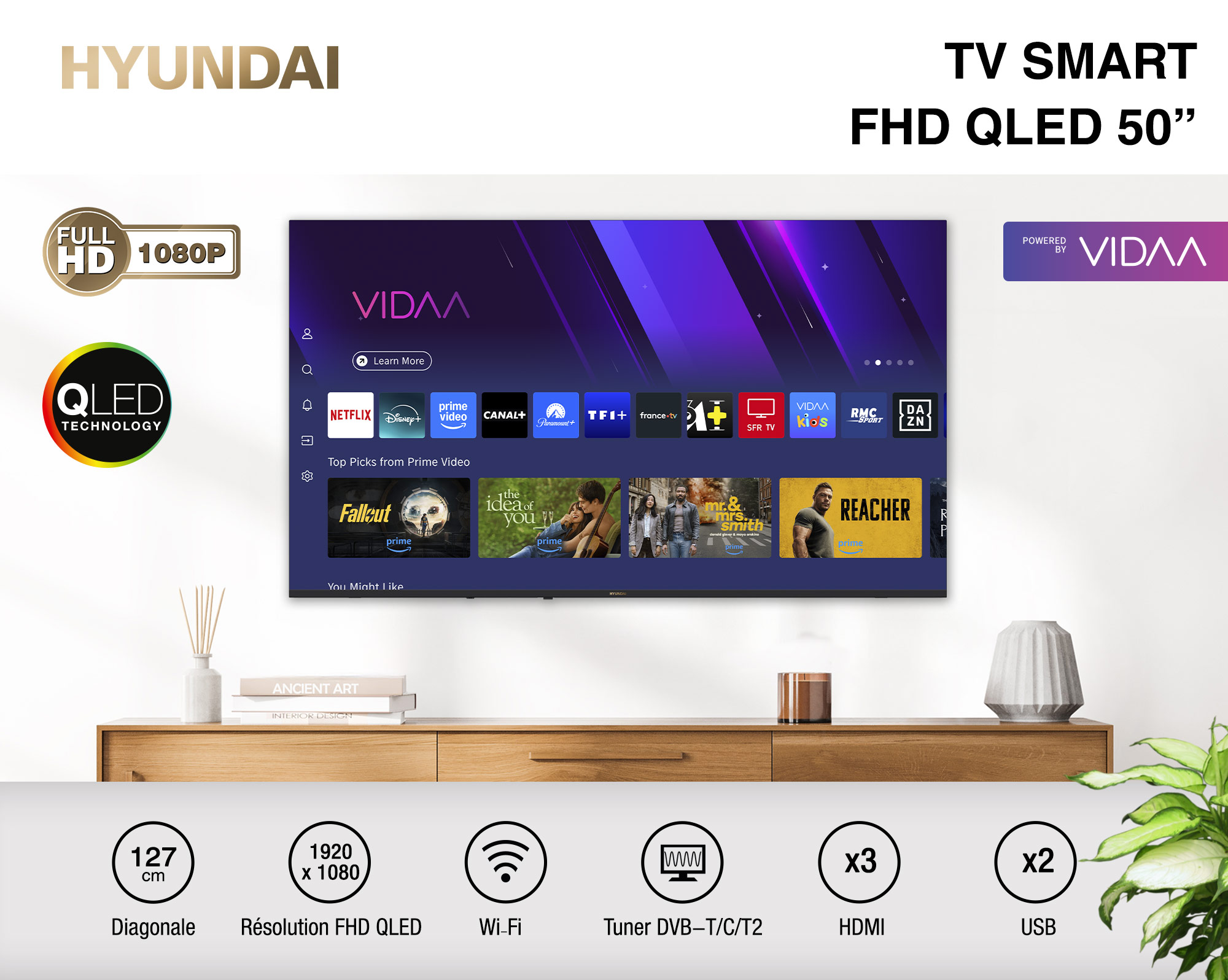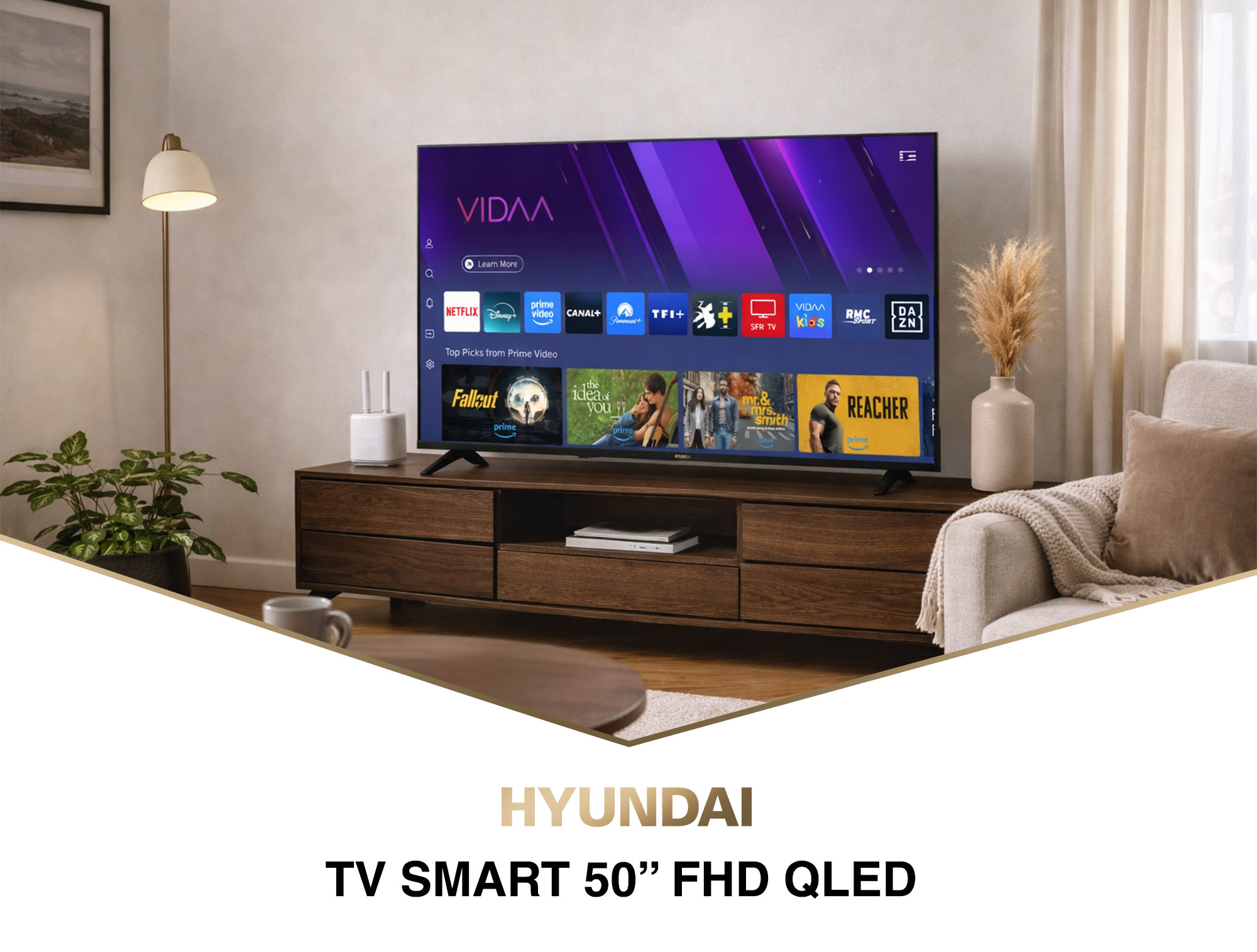 Découvrez une expérience de divertissement immersive avec la Hyundai Smart TV 50 pouces Full HD. Son grand écran 127 cm transforme votre salon en véritable espace cinéma, avec une qualité d’image remarquable grâce à sa définition Full HD (1920 x 1080). Grâce à la technologie QLED, profitez d’images éclatantes avec des couleurs plus riches, une luminosité renforcée et un contraste optimisé pour sublimer tous vos contenus.