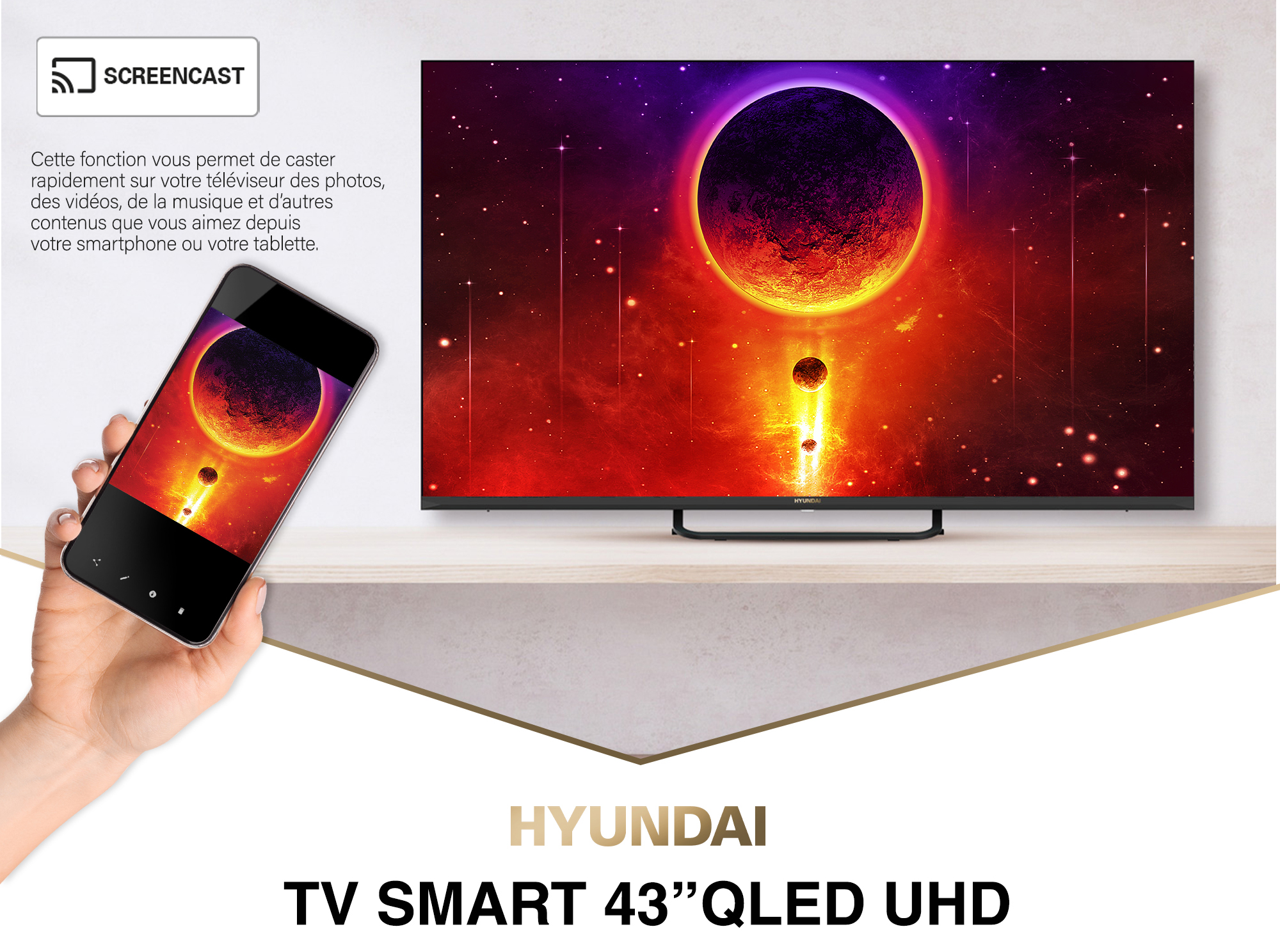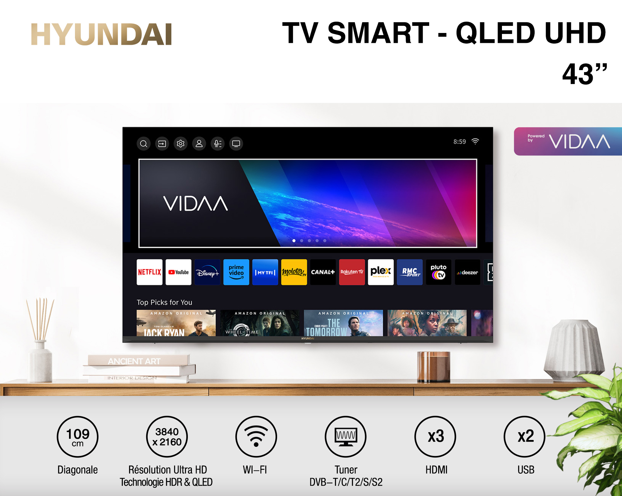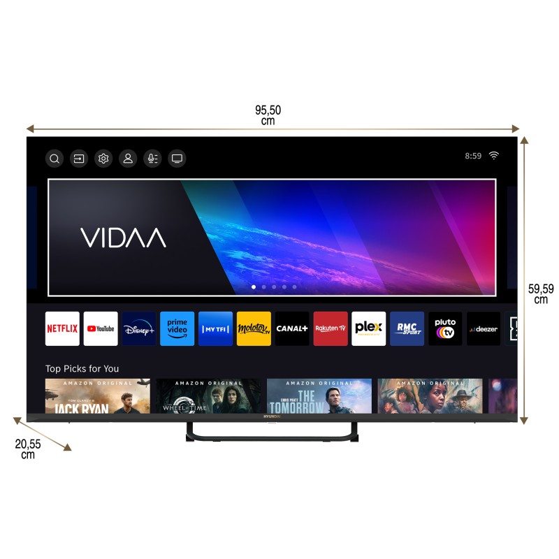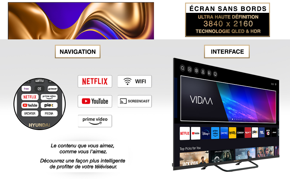 Que vous soyez un passionné de films, de séries ou de jeux vidéo, le téléviseur HYUNDAI - TV SMART 43'' UHD 4K QLED offre une immersion totale. Son design sophistiqué et ses fonctionnalités avancées en font le choix idéal pour ceux qui recherchent à la fois performance et esthétique.