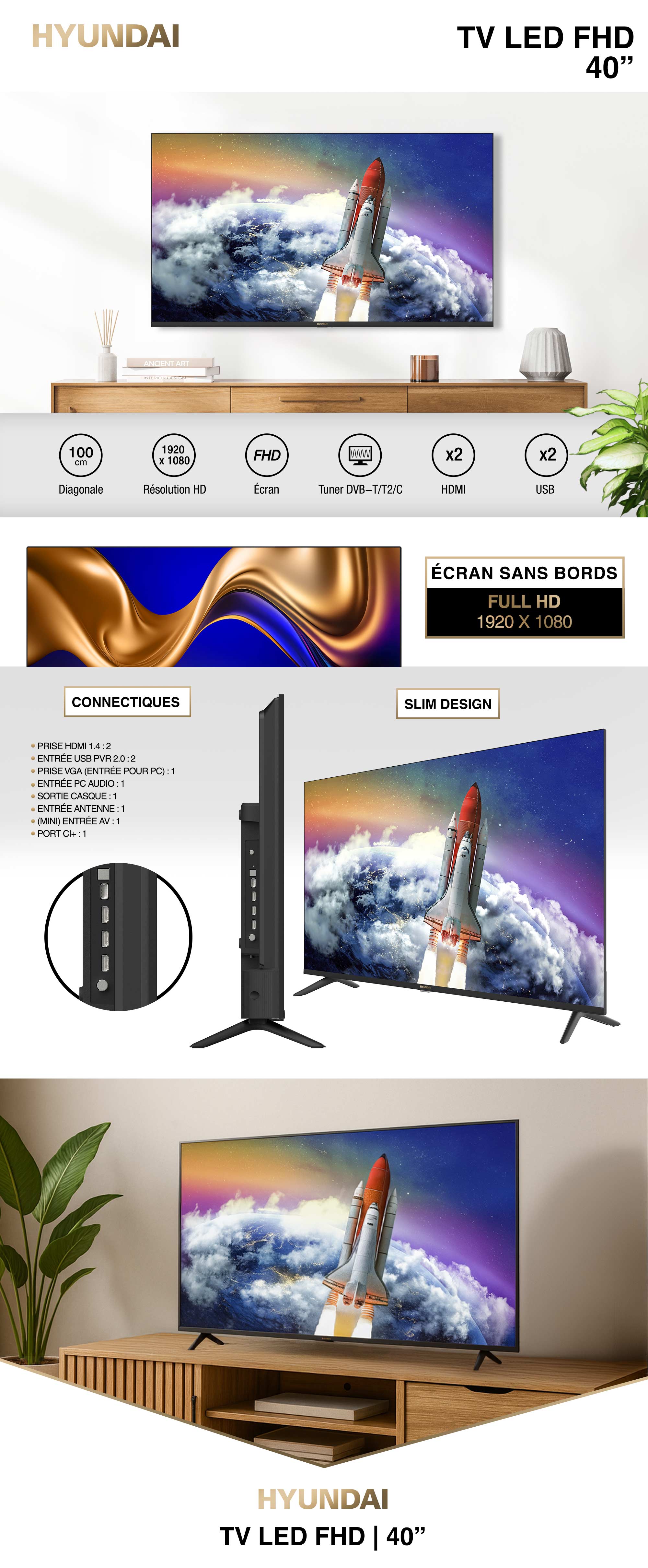 HYUNDAI TV LED 40'' (101 cm) - FULL HD - Triple Tuner - HDMI x3 - USB 2.0 x2 - Sortie casque - CI + - Sortie Coaxiale